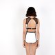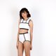 兩件式泳裝,無袖的上衣(有胸墊)附上網格,使你變得更性感,下半身為高腰褲,同樣為你付上網格。經典在與上衣的背後,與一般可看到的泳衣不同,顯現出你與眾不同。非常舒適好穿喔~