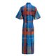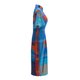 这件女士真丝长衫采用风靡上世纪六十年代香港的红白蓝帆布图案。