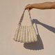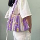 钩针编织 T 型肩背包,小巧可爱 材质:弹性纤维线 尺寸:(请参考最后一张图片) 奶油色:背带长 8 英寸,可延展至 11 英寸 紫色:背带长 11 英寸 现货供应中