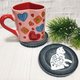 A unique set of 2 drink coasters created from upcycled denim jeans. Measure about 4" in (9 cm) diameter. Work great for mugs and stemware, as shown. You will receive a coordinating set of 2 upcycled coasters. Spot clean only. Wound in a spiral design, these coasters are a one-of-a-kind piece and a fun, eco-friendly addition to your home decor!