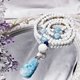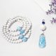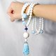 链身以顶级**砗磲**精雕**莲花**珠、**拉利玛**设计。宝石皆为顶级品种,砗磲白净,拉利玛**玉化**程度高,海水纹理优美,闪现梦幻蓝彩。