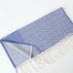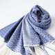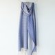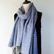 柔和的象牙白纱线作为织底,以鲜艳的灰蓝色纱线织出图纹。在日本传统色中,这是一种接近淡群青色的极美色调。在织纹中,我们加入了深海军蓝的边条作为点缀。布幅的四分之一处改变了织纹,使色彩的呈现方式也随之变化,因此您可以透过不同的缠绕方式,体验多变的风情。建议在春季或秋季可作为上衣或外套的替代,夏季可用于冷气房或遮挡阳光,冬季则可像围巾一样在颈部小范围缠绕。