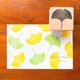 イチョウのスタンプです。 【台木サイズ】 縦4.5cm 横4.5cm 参考写真のカードはハガキサイズです。 【使用したインク】 いろもよう 向日葵色 萌黄色