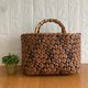 这是一款使用环保纸绳编织而成,带有花结编织图案及竹制提把的篮子包。