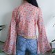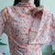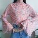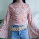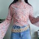 复古花卉网眼喇叭袖上衣,高领上衣,透明网眼氨纶上衣