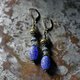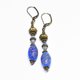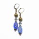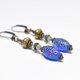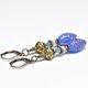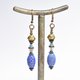 这款耳环串连了露草色的捷克复古珠饰、海蓝宝石与拉长石,以及莲花造型的黄铜珠饰。