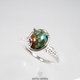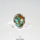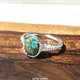 这款戒指以鲜艳的蓝色、独特纹理的土耳其石为主体,精心 set 在带有唐草与镂空雕花的银质台座上。