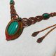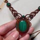 这件编织项链以大地色的蜡线为主轴,搭配孔雀石独特的纹路,编织出向上延伸的对称花纹,主石周围搭配渐层色的线材,从红到绿自然过渡,为整体添加色彩变化与生命力。
