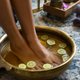 将适量柠檬草足部磨砂膏取出,涂抹在湿润的双足上。