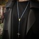 串珠以蓝色多面切割玻璃制成,在光线下折射出耀眼光芒,典雅而庄重。十字架为镀银材质,背面刻有 Lourdes 字样,充满信仰意涵。