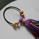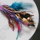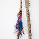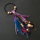 这款发圈饰品采用手工制作,缀有羽毛、木珠、碎布、丝线、针织线和皮革绳等元素。