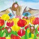 在郁金香盛开的季节里,蓝天和绿地,马铃薯们扮演着勤劳蜜蜂的角色,在花园里歇息、采集花蜜、玩乐、相互开着无聊的玩笑,只存在着美好和安宁。却在此同时,在他们背后的石虎,象征着没有被察觉的危机潜伏。