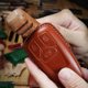 钥匙皮套采用的是皮革塑形工艺,利用皮革强韧的回弹力,经古法技艺制成加以固定成形