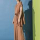 焦糖色的日本凉感纱与莫代尔棉混纺宽裤, 材质柔软舒适. 侧边滚边装饰, 下摆开叉.