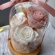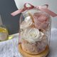 材料80%永生花,20%干燥花搭配制成,搭配松木底座玻璃钟罩。