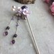 金属材质为铜镀银色,花朵则是用染紫色的贝壳圆片串成,侧边凸出的花苞与三朵花处是用进口工艺用不锈钢线拧成的花枝,可在线长范围内弯折调整角度不易断裂。