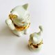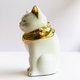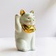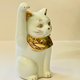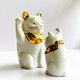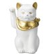 本件作品非常简约,散发着纯洁高级的感觉,猫身没有多余的色彩及花纹,很适合放在家中或衬托不同的物件。与一般招财猫相当不同,也造得更像一只猫,风格独树一帜。白色招财猫象征招财招福,举右手的招财猫加强招财的意喻,金色领巾更加强了好运!