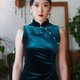 孔雀藍色蝴蝶花旗袍,专为那些追求华丽风采的人而设计。采用弹性丝绒剪裁而成,无袖和露背设计,性感而不失優雅;腰部有褶皱设计,能够帮助遮掩你的肚子。旗袍最初是为探戈派对而设计。翡翠扣子增添了东方魅力,高开叉营造出整体造型的微妙性感。搭配高跟凉鞋,绽放时尚魅力。