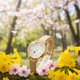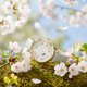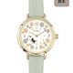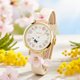 将春天的温柔与灵动完美凝聚于腕间。表盘设计充满巧思,以粉嫩的小花环绕,搭配精致的金色指针与数字,营造出如童话般的梦幻感。最迷人的莫过于那只跃然纸上的小黑猫剪影,正悄悄追逐着蝴蝶,为优雅的设计增添了一份活泼的童心。