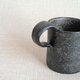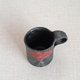 此器皿使用信乐的陶土,以拉坯技法制作成马克杯后,再一笔一笔细腻地手绘上深红色山茶花,并经过多次烧制而成。握把好握,杯口触感滑顺。绘画时考量了陶房自行调配的釉药烧制后的色泽,以及自然花朵的色彩。并以金银增添山茶花的华丽感。花瓣上形成了美丽的冰裂纹。使用金银进行绘画在技术上具有难度,制作时需细心管理作业时的温度与湿度。