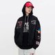 艺术字母平绣增艺术感,后背融合毛巾绣加粗链条绣等让图案新颖。袖侧爱心字母数字榻榻米绣花丰富效果,多样绣花结合,使整体更具特色与吸引力。】