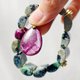 本件**蓝铜矿(凤凰松)**呈现**稀有水墨绿色调**,磨制体硕宽版珠饰,片片珠饰宛若屏风,甚或造物主的画布,纵情挥洒**泼墨山水**纹理,无比独特、美丽。