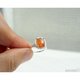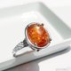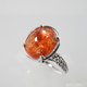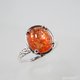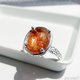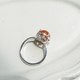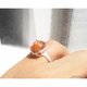一枚镶有亮橙日光石的戒指,镶嵌在带有蔓藤花纹和镂空图案的底座上。