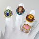 指輪を作るとき、まずメインのビーズを決めます。 そのビーズを引き立てるように隙間なく刺繍をすると、カラフルでにぎやかで、まるでおしゃべりをしているような指輪に仕上がります。 そんな指輪を付けて出掛ければ「その指輪なあに?」とさらにおしゃべりが広がることでしょう。 そうなったらいいなと思いを込めて作ったおしゃべりな指輪です。 飾り部分のサイズ:直径2,5㎝ 指輪のサイズ:フリー(ご自分で調整いただけます) 重さ:約5g 素材:ビーズ、天然石等 ケースは付いていません。小さなオーガンジーの袋に入れてお届けします。