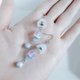 这款时尚的耳环/耳夹,以雾面磨砂质感的白色铃兰珠饰为主体,搭配梦幻的雾面浅紫水晶色月光闪耀(Luna Flash),以及尺寸稍小一号的晕染薰衣草色火烤捷克珠(Fire Polish Czech Beads),再点缀温柔闪耀的玻璃珠等,整体呈现出圆润可爱的风格。
