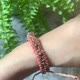 以草莓晶原矿珠为主体,搭配铜珠做点缀,以0.7mm双色蜡线(浅咖/粉橘),手工编织而成的手环。
