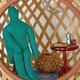 灯饰内部是一个精致的微缩场景:一位布艺天使坐在桌前,悠闲地享用着咖啡。桌上摆放着咖啡壶、咖啡杯以及一本金蓝绿色的笔记本。地面上则有一个藤篮,篮中盛放着几颗由天然石材制成的白色圆球。