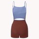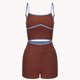 产品特点: 罗纹弹力面料,提供良好支撑 可可色底色,搭配冰川色撞色滚边 柔软尼龙内衬 可拆卸胸垫 可调节肩带 时尚露背设计 一体式短裤设计,活动自如