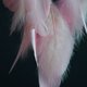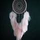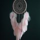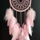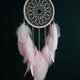 This blush and pink dream catcher consists of wooden ring wrapped with yarn, feathers and glass beads.