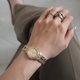 此表款搭配带有温润光泽的象牙白表盘,以及金色表壳与指针,整体散发出高雅柔和的气质。表带采用品牌首字母“H”造型的链节设计,不锈钢与金色调的完美结合,为手腕增添一抹亮丽光彩。
