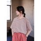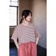 纯棉的材质,低捻的纱线,轻微的干爽,更多的棉柔,干净不黏腻,她的质地连吸色的光调也是哑光感的。宽条纹,大面积的粉色留白,上面再用黑色条子相撞,即柔和也略带稳重。