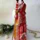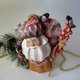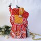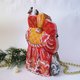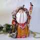 用三只鸟雕刻俄罗斯圣诞老人。圣诞老人穿着丰富的红色和金色。绘有白色蕾丝装饰,错综复杂。鸟儿聚集在善良的圣诞老人身边,坐在他的手杖和毛领上。
