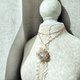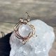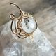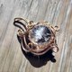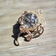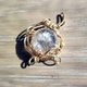 白水晶球金属线编织吊坠,金属材质为金色艺术铜线,整体尺寸(长x宽)为36x26mm。
