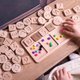 木制数学游戏板非常适合学龄前儿童早期学习加法和减法。这款玩具包含在木制数学材料中,完全天然,由山毛榉和胡桃树制成。对健康无害,不含任何胶水、油漆或有毒物质。这款木制数学游戏由47 个棋子组成,包括2 套用于运算的0 到10 的方形木制数字和1 套用于结论部分的0 到20 的圆形木制数字、3 个数学符号(加法、贴纸和等于)和 40 个绒球。