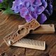 This folding comb made of natural wood. One side of the comb is decorated with carved ornaments. For protection from moisture, it's covered with with wax.