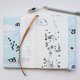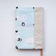 The front of this cover is made with an original design; an aquamarine blue fabric of penguins chilling out among the glaciers of Antarctica. The cover is mostly machine-sewn with a penguin motif hand-embroidered on the corner. A little peephole is worked into the front of the book cover to store a pen/pencil, making it fuss-free travel writing / drawing kit.