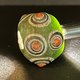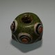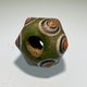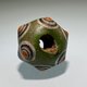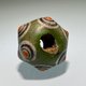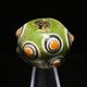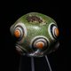 这是一颗来自西亚地区的古老琉璃珠,主体为深橄榄绿色琉璃所构成,表面镶嵌多层突眼对称的九个“眼珠”纹饰,每一个眼纹皆由红色、白色、黑色所构成的同心环排列而成,构成极具神秘感的视觉符号。每一个眼纹皆以手工高温烧制而成,呈现出同心却略显离心的古工艺特,既具护身象征,也代表古代文化对“神秘凝视”的信仰传承。这类“眼珠纹琉璃珠”(Eye Beads),最早可追溯至公元前1500年左右的西亚、美索不达米亚、腓尼基等古文明区域,后来延续至罗马帝国时期与东地中海沿岸文明,成为古代重要的宗教护符与贸易物品。根据考古发现,这类珠子常被放置于墓葬中,用作护身符、避邪器与社会地位象征。其最原始的文化意涵,是源自对“恶眼”(Evil Eye)的恐惧与防御。“眼珠”的形象,不仅象征神明的注视,也象征一种神秘的保护力;当这种设计应用在琉璃制品上,就成为“多层眼珠琉璃珠”的起源。而这件九眼琉璃珠的工艺,不仅重视色彩的对比与视觉吸引,更强调每一层圆纹的精准黏合与熔接,使整颗珠子看起来仿佛活着般地“注视”周遭。从材质上看,这颗琉璃珠经高温融熔、拉丝与多次点镶加工而成,体积饱满,玻璃体内部均质,并具有古琉璃所特有的风化痕迹与微弱晶化现象。由其颜色、构造与铸工风格来判断,可确信此珠制作于公元前6世纪至公元后2世纪之间,产地推估为今叙利亚、黎巴嫩沿海或古波斯与地中海东岸交会区。此珠直径2.2厘米,重量14.7克,具极高的展示性与象征价值。其九眼设计,与中东及伊斯兰文化中常见的“九数神圣性”相关,象征圆满、极致与保护,在文献记载中常与祈愿、仪式与战士护身有关。此外,此颗珠子的钻孔两端亦呈现自然的穿磨痕迹与珠体表面天然风化痕迹,并有原始泥土残存于孔内,这些都是古珠真品的重要佐证,极具收藏与研究价值。无论从历史文化意涵,或文玩美学角度来看,皆为不可多得之佳品。