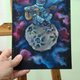 这幅画不仅仅是一幅图像,更是通往梦想与灵感世界的大门。它非常适合富有创造力的人、亲密的朋友、生活中的浪漫主义者,以及那些能够在最意想不到的地方发现美的人。当你欣赏这幅画时,你会发现这位宇航员不仅仅是在弹吉他。他从太空本身、从寂静和无限中创作音乐。他的手指拨动琴弦,但旋律不仅诞生于声音,也诞生于他的灵魂,诞生于他的思绪,飘向遥远的星空。这幅画提醒我们,即使在最平凡的事物中也能找到灵感,音乐存在于我们心中,而空间不仅仅是我们周围的空间,也包括我们内心的空间。这份礼物将激发新的成就,在这个广阔而美丽的世界中寻找属于你自己的旋律。这幅画是用油彩在纸板上绘制的,尺寸为25x17.5厘米。我会回答你的所有问题。