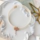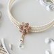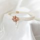 这是一款三层金属线颈链,结合了柔和色调的塑料珍珠、大尺寸的山茶花吊坠与水晶玻璃。