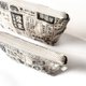 使用泰维克纸作为主面料,将台湾早期独有的报章广告图样结合在特殊环保材质上。材料本身环 保可降解、质地轻量同时具有织品特性,随着使用后产生的皱褶纹理,加深仿旧的质地,是皱皱包的一大特色。