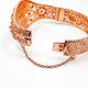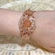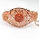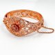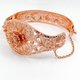 每一丝曲线、每一道纹理,皆精雕细琢;这件手镯以繁琐的掐丝工艺,呈现立体繁复的花卉图腾,仿佛一座凝结于腕间的精致花园。玫瑰金色泽温润柔美,为整体添上一抹优雅复古的浪漫氛围。中间盛开的立体花朵,如雕塑般精致,与镂空花叶交错呼应,展现极致的对称美感与古典格调。这件手镯不仅是一件珠宝,更是一段手工艺术的延续与传承。