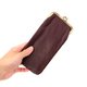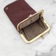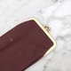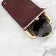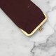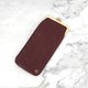 酒红色的长款眼镜套,配有零钱包的金属开关,外面是仿皮材质,里面是仿绒面。右下方有一个小孔可以连接链子,便于携带,也可作旅行小袋子。