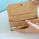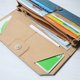 考量到水洗牛皮纸具有弹性,长夹之卡片夹层皆制作的较刚好,初期使用放卡片时会比较紧不易放置,使用一段时间后因水洗牛皮纸之延展性,会让夹层空间变松更好拿取 。