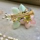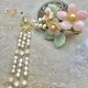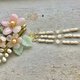底下的夹子全长约6CM,使用天然粉水晶做花,叶子为仿玉色的琉璃叶片,使用天然珍珠做花苞,枝梗以进口钢线拧成,可在长度范围内调整花叶姿态,此款因材质的关系会有一些重量,无论是选择哪种夹子,在使用时都请伸到花样底下使力,两侧的花和花苞等都是做腾空的,垂坠为活动挂钩。