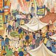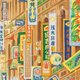 《南街殷赈》为郭雪湖以夸张、戏剧化手法描写大稻埕迪化街霞海城隍庙口节庆热闹景象,庙口拥挤的市井小民忙碌纷扰,五彩缤纷的招牌远近林立,不但有日本人回“内地”所需购买的台湾特产礼品店,也有中国的药材店,还有写着英文字样的店面,由此可见当时台湾商圈的繁华多元,全图也充满社会现实性及视觉趣味性。