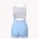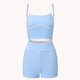 产品特点: 罗纹弹力面料,提供良好支撑 婴儿蓝底色,搭配白色滚边 柔软尼龙内衬 可拆卸胸垫 可调节肩带 时尚露背设计 一体式短裤设计,活动自如